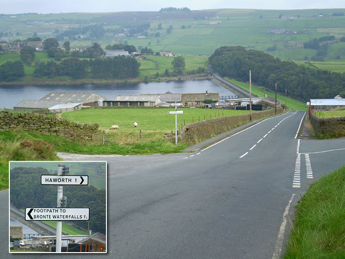 Most people combine a visit to the waterfall and Top Withens since they are on the same popular path. You can leave from the Parsonage but, if you want to save your legs, you can park (or catch a bus) closer. The best place to park is on Moor Side Lane which runs between Stanbury and Oxenhope. There are several free areas to park, one with a toilet. Opposite the toilets is a path marked Top Withens but this by-passes the waterfall so, unless you want to ignore it, head north a short distance from the toilets until you find a path marked "Footpath to Bronte Waterfalls" (directly opposite the road to Haworth: see picture right). The path to the waterfall and Top Withens is generally good although you can come across some wet sections, especially away from summer, so good boots are wise.