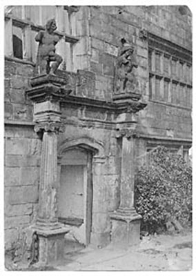 The entrance to the sitting-room has grotesque carving over the front and around the main door. The door has griffins and 'boys' (cherubs?) carved above with the date 1500 and the name 'Hareton Earnshaw'. This leads directly into the family sitting-room, big enough to hold a fifteen-man band. (In other farms, it generally was the sitting-room and kitchen but Wuthering Heights had a separate kitchen.)